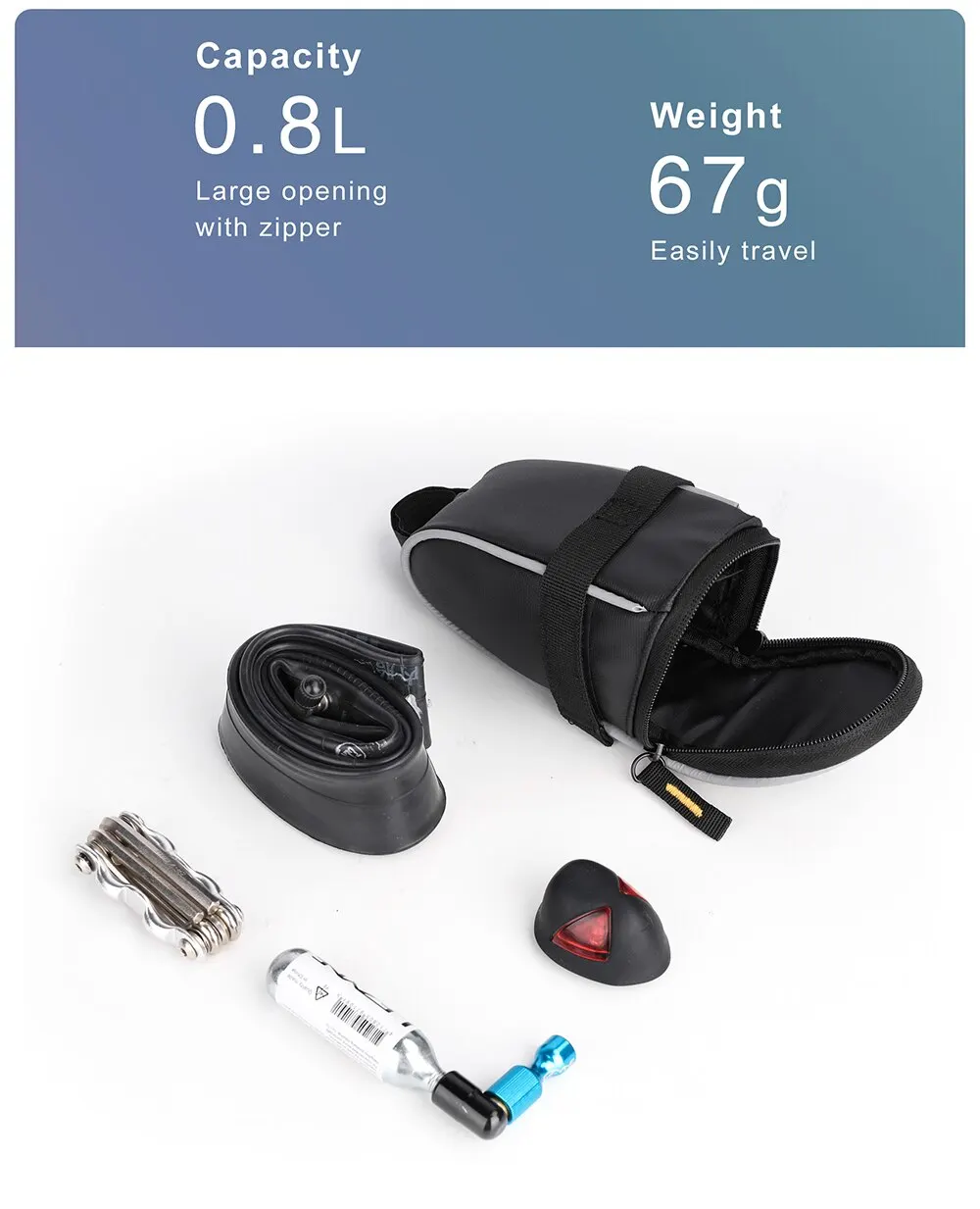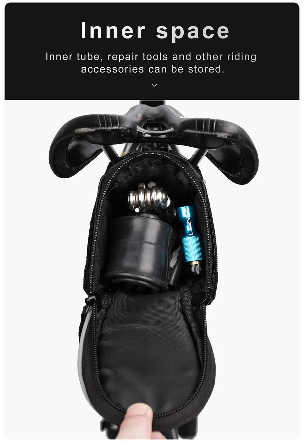 【LARGE OPENING WITH DOUBLE PULLER】 Inner tube, repair tools and other riding accessories can be stored.